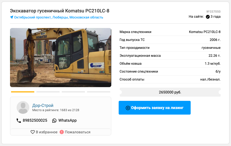 - Размещение кнопки "Купить в лизинг" в карточках объявлений о продаже спецтехники.